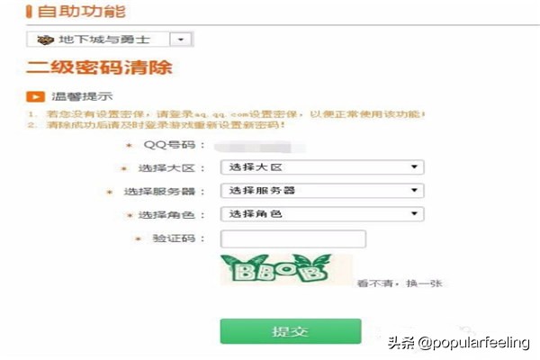 4.依次选择大区、服务器、角色、输入验证码之后即可清除DNF二级密码。