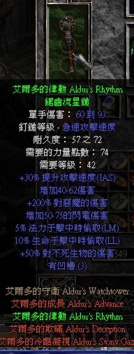 艾尔多的律动是德鲁伊的专属套装艾尔多的守卫之一的单手流星锤武器,它的亮点在于双吸和3个孔,往往初次接触暗黑的小伙伴见到它就会被它深深地吸引了,这属性加上3个孔简直是“神器”啊!这么好的武器孔里镶什么好呢,可别浪费了,如果你了解之后你会很失望!