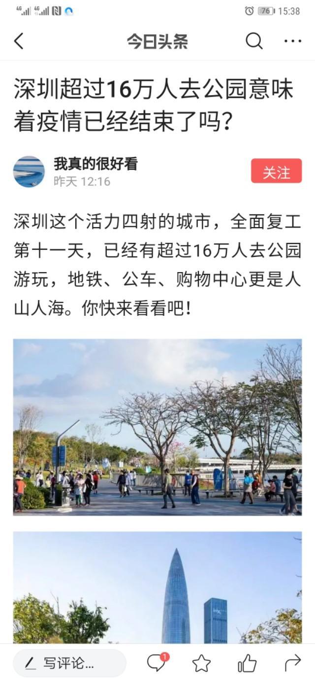 深圳这座充满活力的城市,已经全面复工十多天了,已经有超过16万人去公园游玩。地铁、公交、购物中心更是人山人海。虽然公园管理处等公共场合都有深圳义工在尽力筛查危险情况,但是疫情毕竟还没有结束,为了不给他人添麻烦,咱就宅在家里不出门也是为抗疫做贡献。