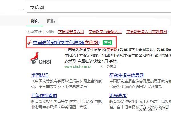 2、在搜索结果处找到学信网官网并点击进入。