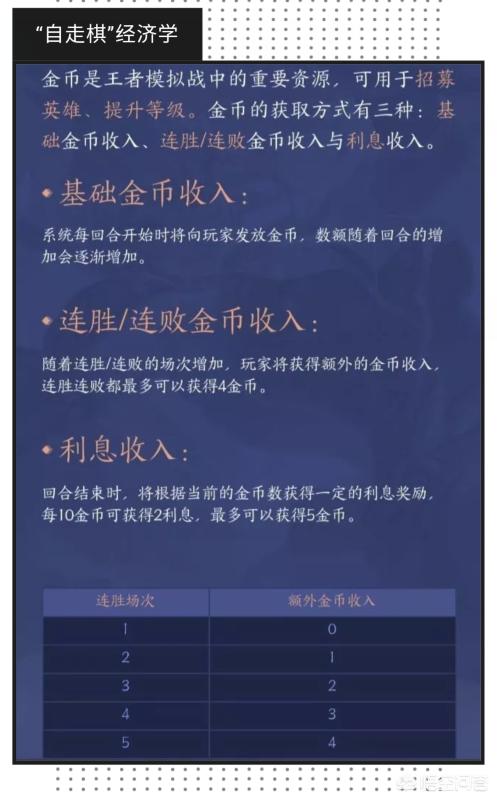 其实如果你有接触过自走棋的话,对于自走棋的经济应该比较好理解,在王者荣耀自走棋中也同样每回合会发给各位基础金币,连胜、连败的时候也会给予一定的经济补偿,在存款达到10、20、30整数的时候还会给到利息经济,王者荣耀自走棋中利息经济上线是30,所以各位可卡住30的经济花钱,这样可以让经济最大化。