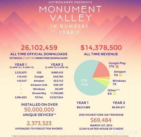 那在中国这类游戏的收入如何呢?实际证明还是相当不错的。中国是现象级游戏《纪念碑谷》第二大收入来源,仅次于美国本土,说明在大陆对于此类游戏是有其市场,但没有合格的游戏去填补这些空白。