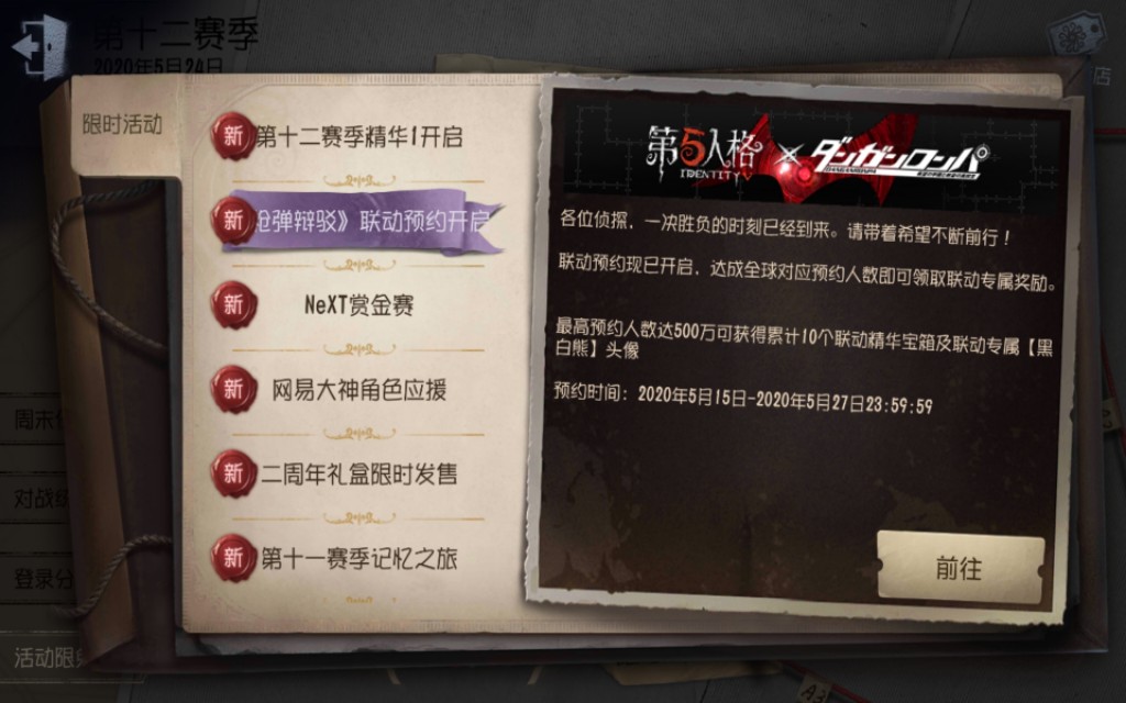 相信大家都知道最近的第五人格X弹丸论破(游戏枪弹辩驳)联动了吧。在联动前,官方举办了一个活动:预约人数过500万,就可以获得十个联动精华和一个限定黑白熊头像。奖励很馋人对不对?那么就有玩家发问了,该如何预约呢?别急,让我来教你
