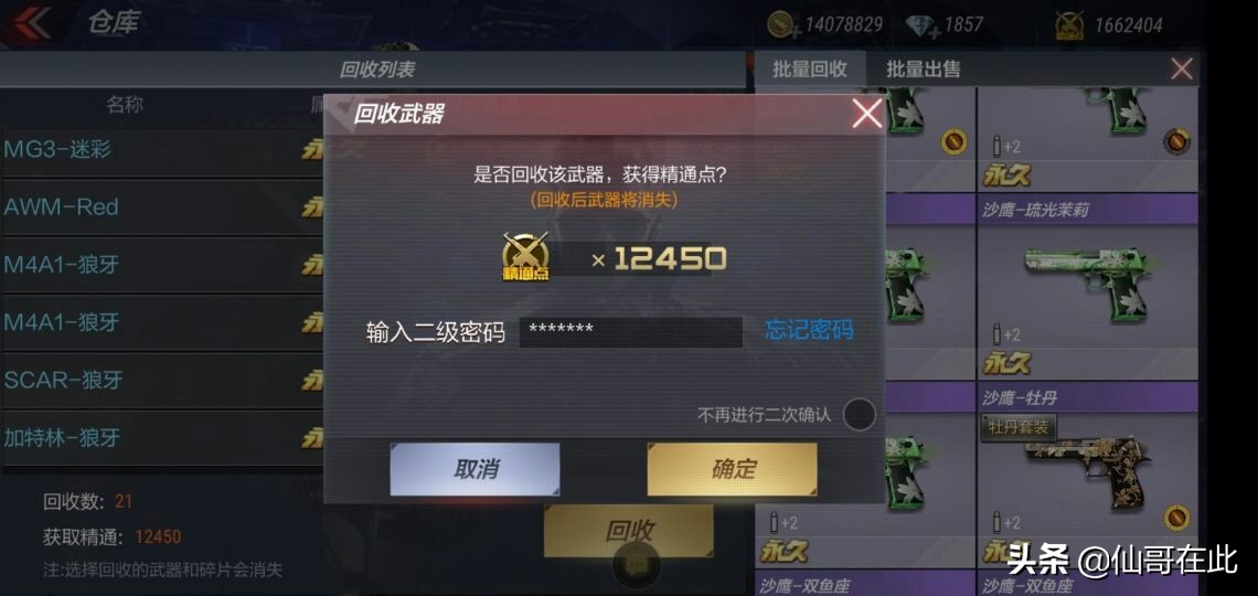 这是保护你财号好办法。当有仇r想要销毁武器的时候,必须经过仓库二级密码验证。这能很好地保护自己的财产安全。