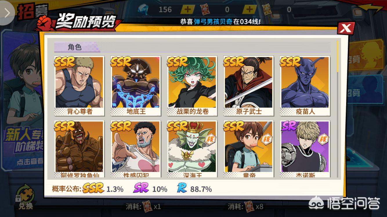 先给大家说一下这里面能抽到的ssr有哪些:背心尊者,地底王,龙卷,原子武士,疫苗人,独角仙,性感囚犯,深海王,童帝以及波罗斯。这几个在游戏里被评定为SSR,其余的你觉得很强力的他们目前还没有加入到游戏,并非实力不够,比如恶狼,金属棒,邦古等等。恶狼的话现在不能被抽到,但是以后估计会被加入!
