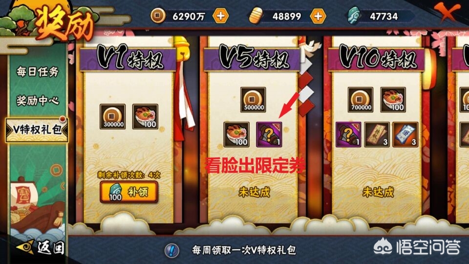 关于限定招募券的获取渠道还是比较少的,有时候还是随机的概率出现,比如每周的V特权礼包,只要达到V5以上就可以领取到一个“随机招募券”,就是下图中的那个看起来像秘卷碎片一样的图标,这个是会随机送高招券或者是限定券,我运气还算不错,最近两三周都是限定券,这是为了让我招募忍战丁次做准备呢。