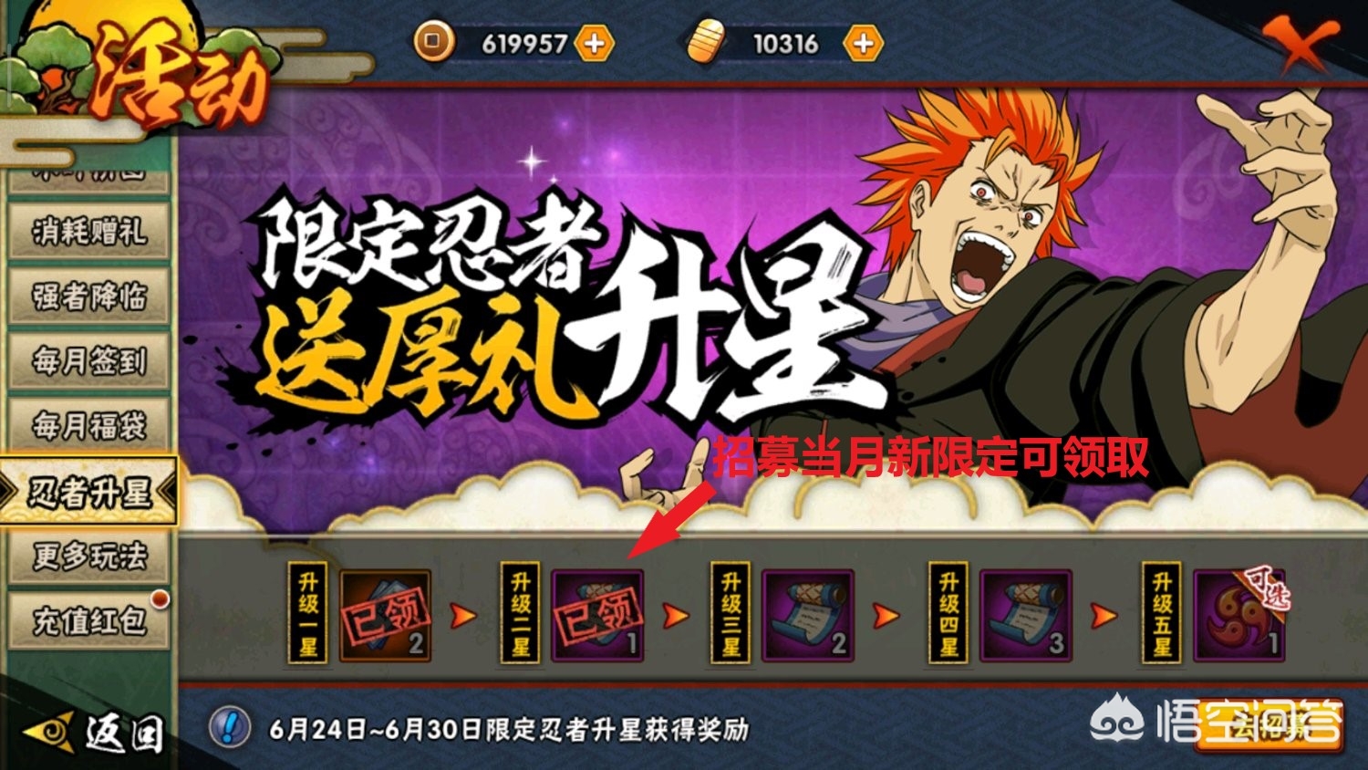 还有一个渠道就是当月有新限定忍者上架的话,如果你招募了这个忍者,在月底的升星活动里也是可以领取到一张限定券,也算是你招募了这个忍者的附送奖励吧,但是也可以理解为魔方想要让你补齐剩余的限定券来招募接下来的限定忍者。(升到五星可领取S忍碎片自选,但这个并不划算,而且会很亏)