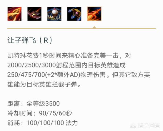 利用R技能拥有超远的射程和超高额AD加成,配合装备达到的高护甲穿透来提升输出伤害,再加上冷却缩减,可以让凯特琳更频繁的使用R技能。凯特琳的R技能可以从装备中获得2倍的额外AD加成,从装备中获取的物理攻击力可以让凯特琳的R技能伤害有直线提升。
