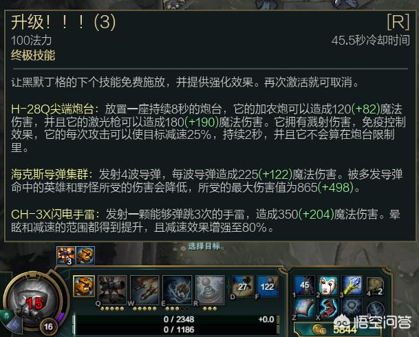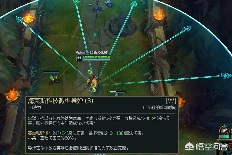 黑默丁格的W技能想前方放出5枚微型导弹最低基础伤害为24最高伤害为216+045的法术强度。可以附带冰杖减速效果,面具灼烧效果。