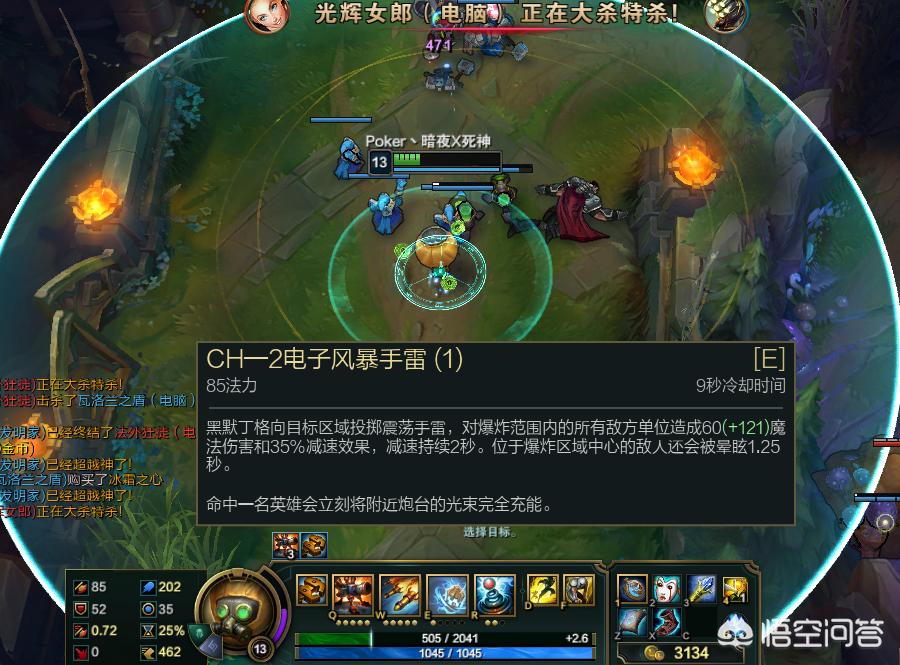 E技能电子风暴手雷在爆炸范围内的敌人造成60+0.6的法术强度伤害并减少百分之35移动速度,在手雷的中间会被眩晕1.25秒