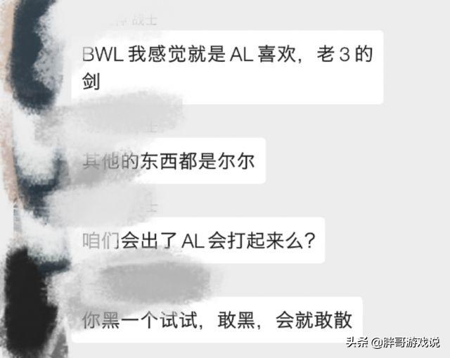 还有一张图上有人问“咱们会出了AL会打起来么?”后面有人说“你黑一个试试,敢黑,会就敢散”,我觉得也属于开玩笑的范畴,讲道理,如果真要黑装备还会提前差不多一个月的时间和会员们打好招呼:“大家好,我准备黑AL和老三的剑了,大家到时候不要介意哟~”这样吗?所以很有可能就是公会群里日常互黑调侃开玩笑而已。
