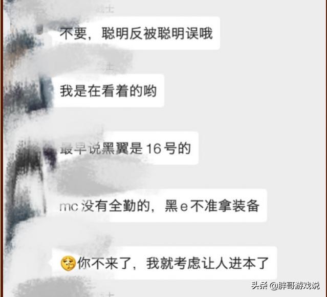 再加上从所谓“曝光”的聊天记录来看,我觉得完全是公会群里几个玩家在开玩笑而已……首先在上文出现“MC没有全勤的,黑E不准拿装备”之后,下文立刻发了一段带有表情的话,试问一本正经严肃说事的时候会使用这个表情吗?