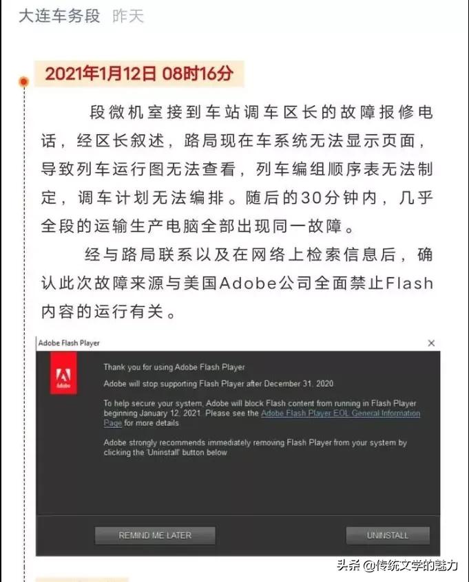 本月中旬(1月12日)大连车务段的系统故障,官方公众号的答复是Flash停用导致的,Flash要停用,都发公告多长时间了,没人去更新系统啊,只有出问题了才会去解决。[灵光一闪]管中窥豹可见一斑。