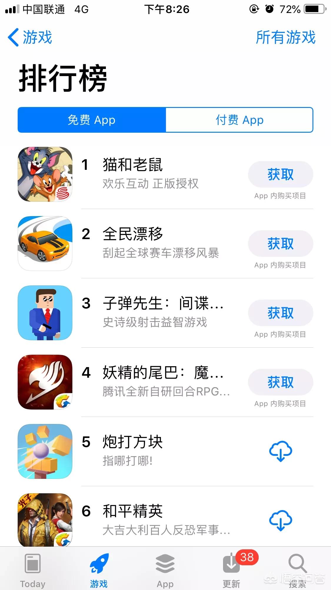 可以看出第一位是猫和老鼠,猫和老鼠是新上线手游,本人还没有体验,但是据我分析猫和老鼠之所以目前排行榜第一是因为下载量,大家都知道苹果商店的排名是按下载量来排名的,新游戏提前就宣传,再加上玩家尝鲜,还有好多80.90.00后从小都看过猫和老鼠的动画片,难免有一种情怀,所以我个人认为这个数据和前几天和平精英霸榜苹果商店是一样的,大家的目的都体验和尝鲜,聚一时的人气罢了。