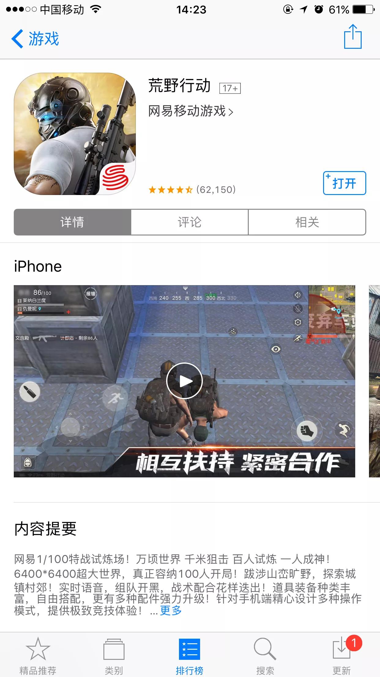 No.4:这个位置就要给目前市面上比较火的吃鸡网游《荒野行动》了,自从《绝地求生》火了以后,市面上出现了很多模仿它的手游,而且刚开始下载量都还不错,不过最成功的还是这款网易出品的《荒野行动》,无论操作、画面都与吃鸡相差无几,由此可见这款游戏的潜力是巨大的。