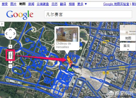 3、拖动地图左侧的小黄人到地图之中,这时地图就会出现蓝色的线条,这表示可以进入街景模式。