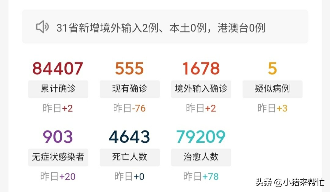 全国累计确诊有84407人,现有确诊518人,境外输入确诊1678人,昨日新增2人,是在陕西的境外输入病例,治愈人数新增78人,