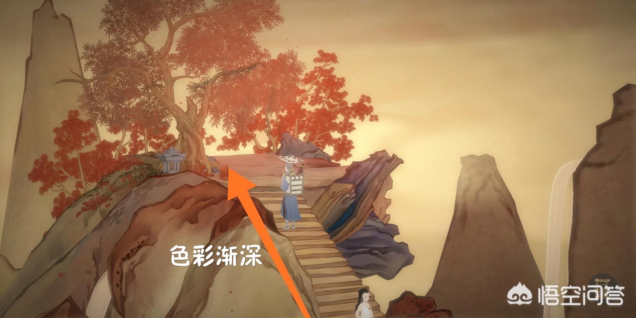 游戏对色彩的运用参考了国画,即《千里江山图》。画面着色极少,可谓惜墨如金。如游戏序章救治树木情节,画面只有灰,棕,红三色。通过三色叠加,反应色彩差异。从石阶起,色彩逐渐加深,层次分明。