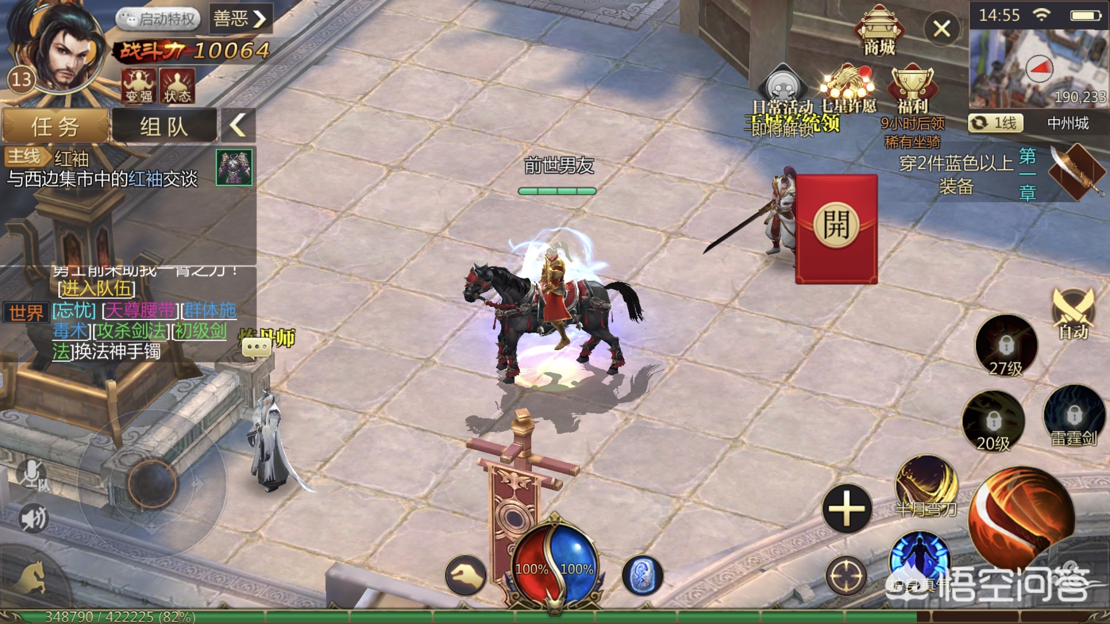 请看上面的画面吧...从整个界面上来看,请注意:战力???任务???自动寻路???还有那右上角地图旁边显眼的“商城”....