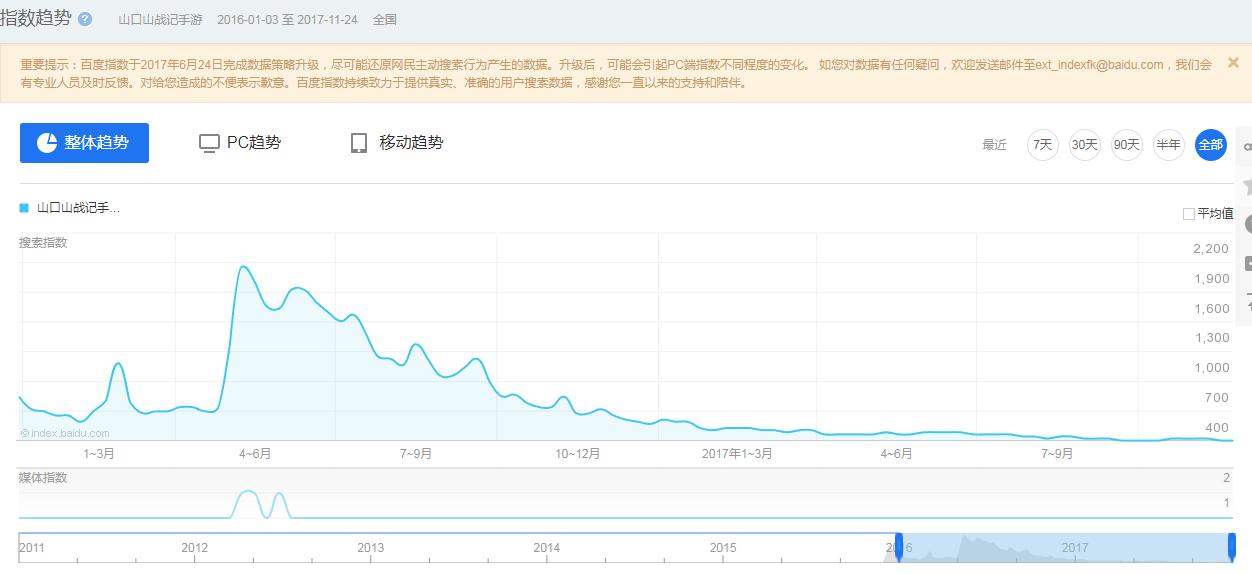 我从百度指数上看到从2016到现在搜索手游《山口山战记》的数据如下: