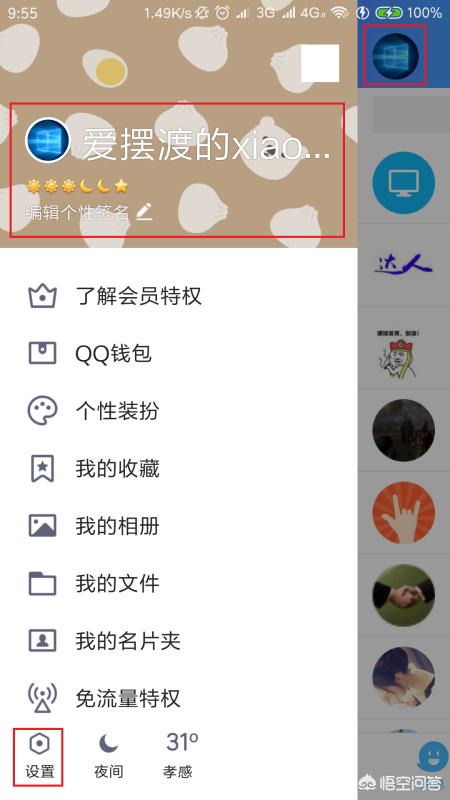 1、打开手机QQ应用软件主页面,点击页面左上角个人头像,在打开的页面中,点击左下角“设置”按钮。