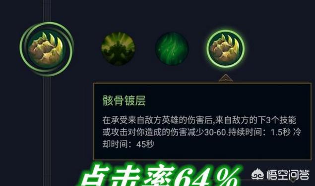 骸骨镀层以64%的登场率位列第二,这个符文也是非常多的英雄都比较使用的,可以减少敌方对你造成的伤害,虽然只有30-60点但是前期效果非常明显,任何路线的英雄都可以使用这个符文来防止敌方的消耗能力。