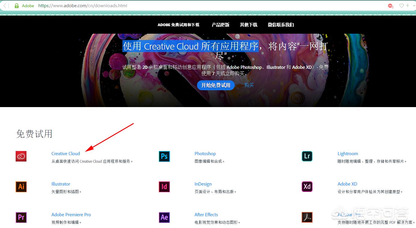 安装也很简单,直接搜索 Creative Cloud,使用该程序,安装所有正版7天试用软件。也可以在Adobe中文官方下载它,下图免费试用那四个字下面,红色的睡8图标就是了。软件内有详细步骤提示,按要求操作即可,把你需要的PS安装好,其它的软件也可以一起安装。安装好后,下面是手术部分了。