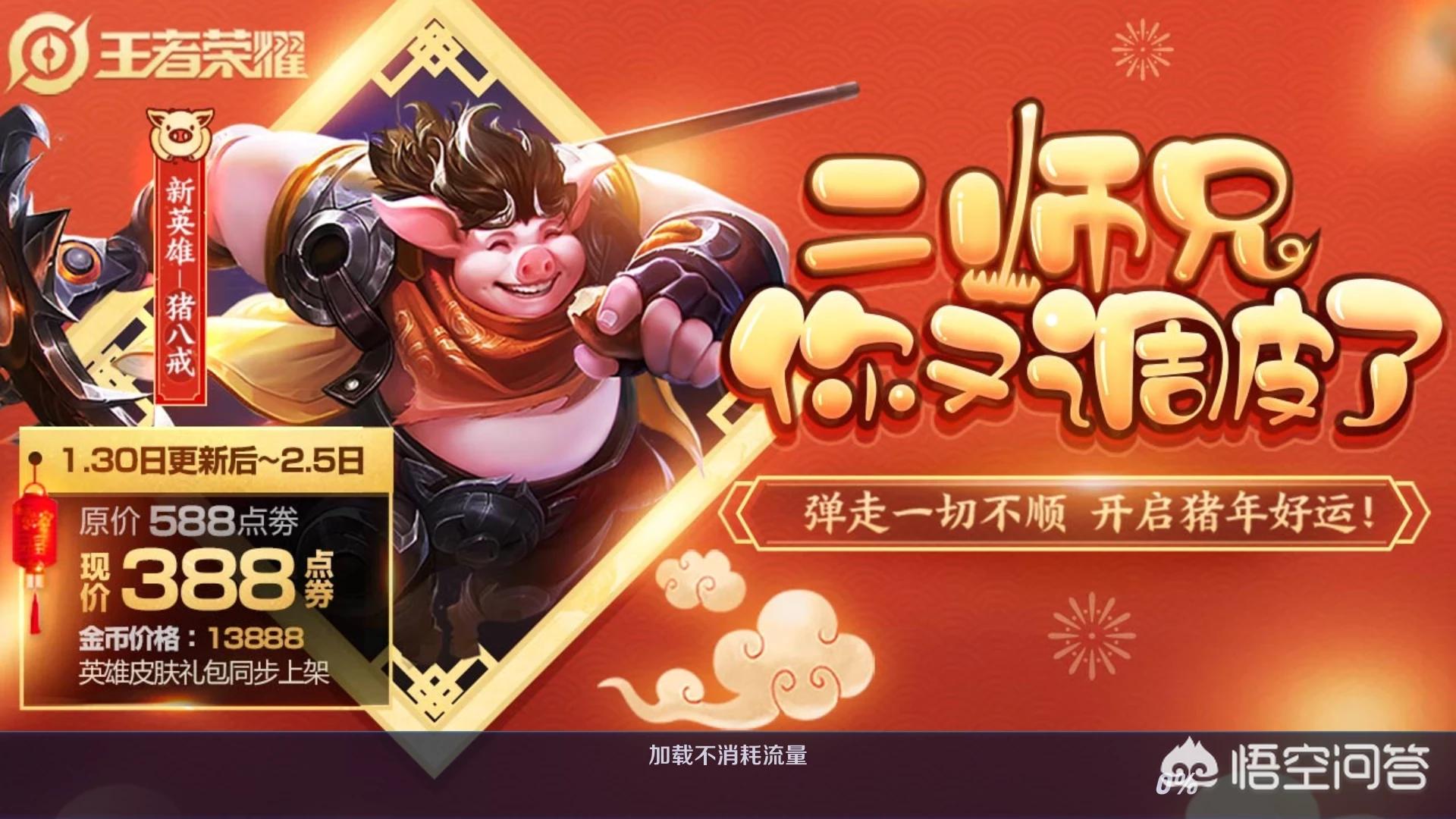 我们在回过头来看一下猪八戒,这个英雄猪八戒,这个英雄现在是1月30日更新之后一直到2月5号,原价588点卷,现价只卖388点卷,所以说她为了卖这个英雄,肯定会让猪八戒加强强势。所以在短时间内猪八戒并不会得到消弱。如果过了春节之后,可能就会面临着消弱的问题。