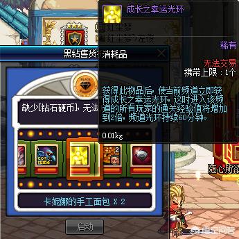 成长的幸运光环是黑钻售货机的道具,从60版本就开始有了,获得之后可以使当前频道的所有玩家通关经验增加两倍,并且持续60分钟,然而逼格这么高的道具,从60版本至今还没有听说有人抽到过。