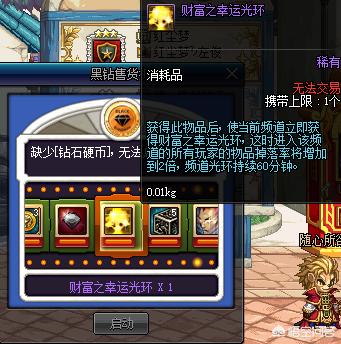 同样是在黑钻售货机里的道具,财富之幸运光环可以使当前频道的所有玩家物品掉率增加2倍,要是真有人抽到这个这个频道将会是所有搬搬砖玩家的天堂了,不过抽到的几率却是0.
