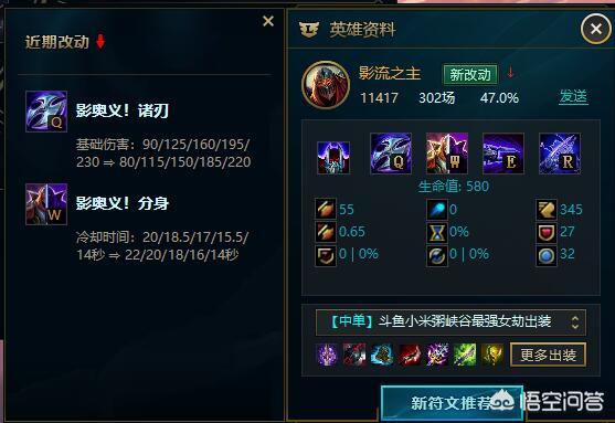 现在发这个文章可能有点迟了,因为纳尔对后来劫的削弱并不知情,昨天与朋友开黑时选择劫的时候,wegame的英雄推荐上居然写着新改动,劫居然tm被削弱了!没天理啊,后来去翻看近期的改动方案后,发现大部分英雄包括剑圣木木等得到加强,劫却被削弱了。