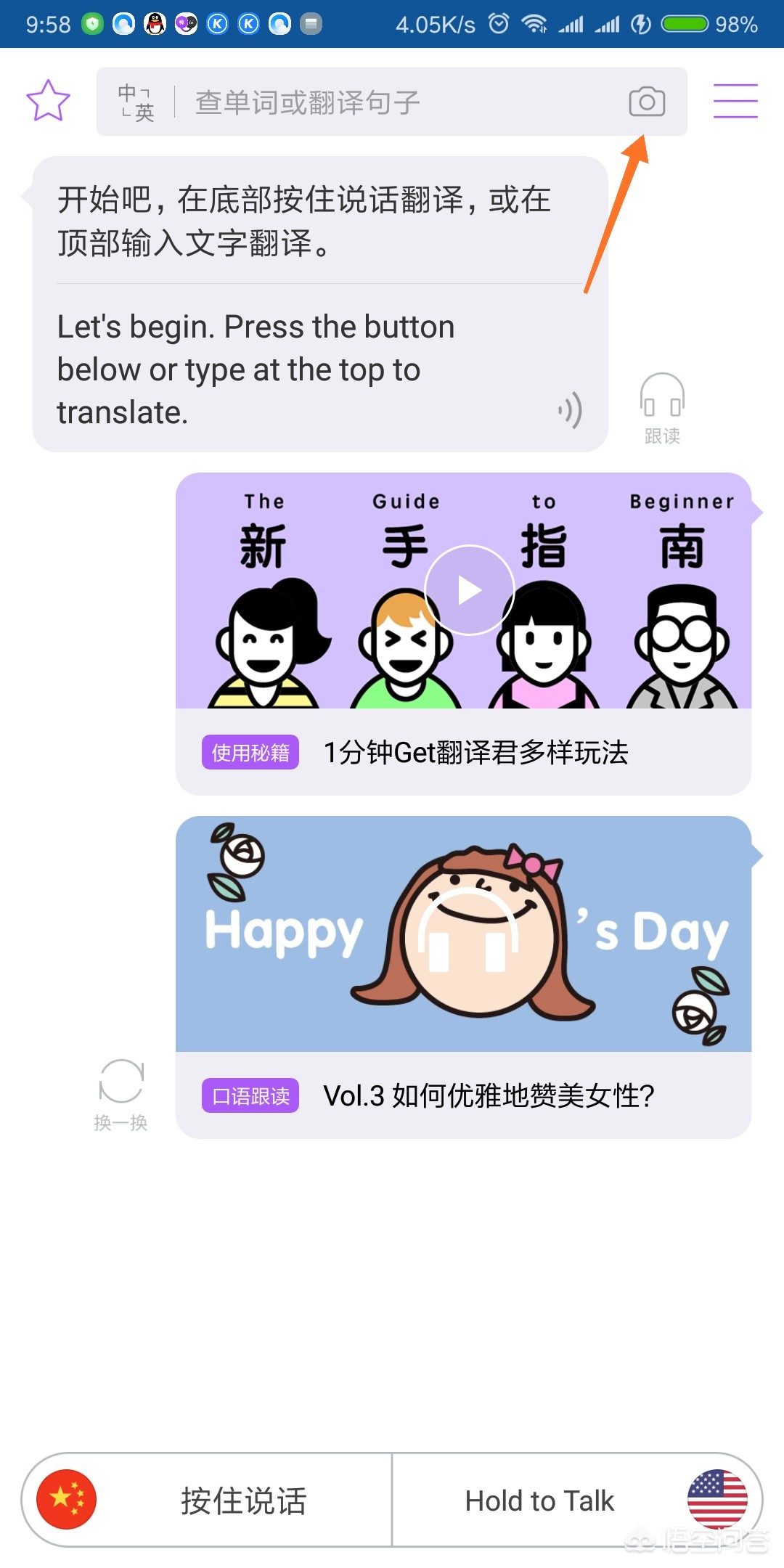 点击那个摄像头进行拍摄,然后就能自动翻译了,
