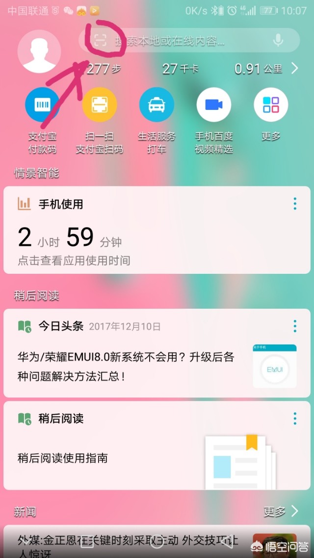 3.返回主页右滑动屏幕就进入负一屏了,找到屏幕上方搜索框内扫一扫功能,如下图: