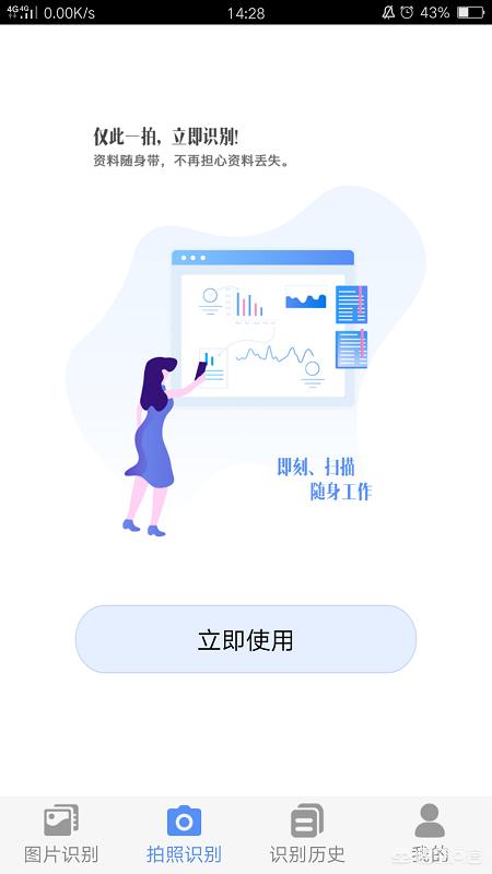 打开文字识别软件之后,选择拍照识别这个功能,点击立即使用。