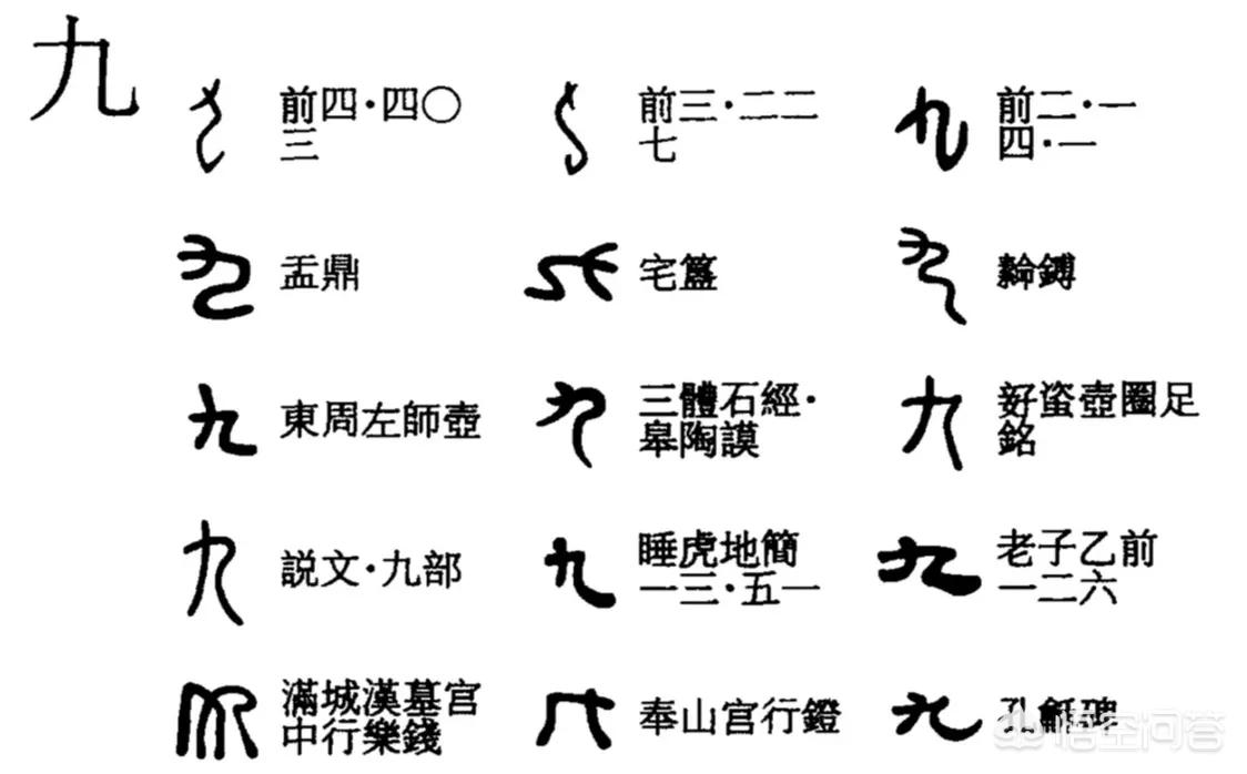 “九”这个字一开始就是在表示数字九,到也没多大的变化。“九”在哲学意义上是阳极之义,在《易经》里面,“九”就是代表阳爻的意思,“六”就是代表阴爻的意思。所以那爻辞开始的“九”和“六”就是这个意思。