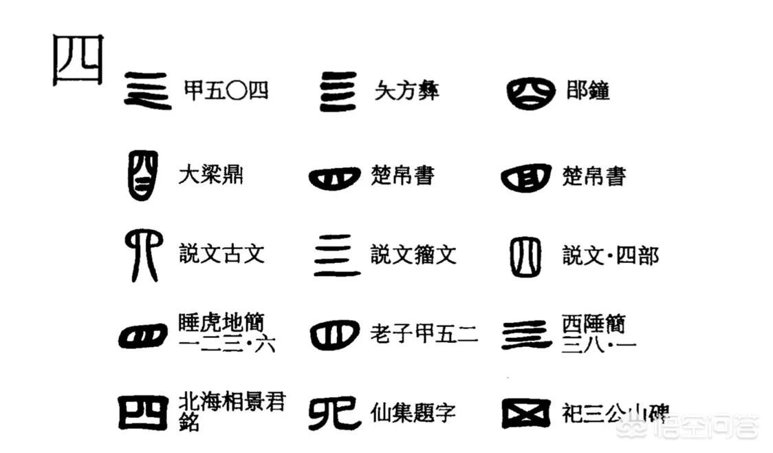 “四”还是依照前面的数字一样,“亖”这个就是古文的四字,也可以是四个等长的横。如今我们用的这个“四”字,本来是鼻涕的意思,之后“四”字用来表示数字四,鼻涕就加了三点水为“泗”来表示。在现代有些人认为“四”不是一个吉利的数字,但是在古代“四”是一个很有寓意的数字,比如四象等等。