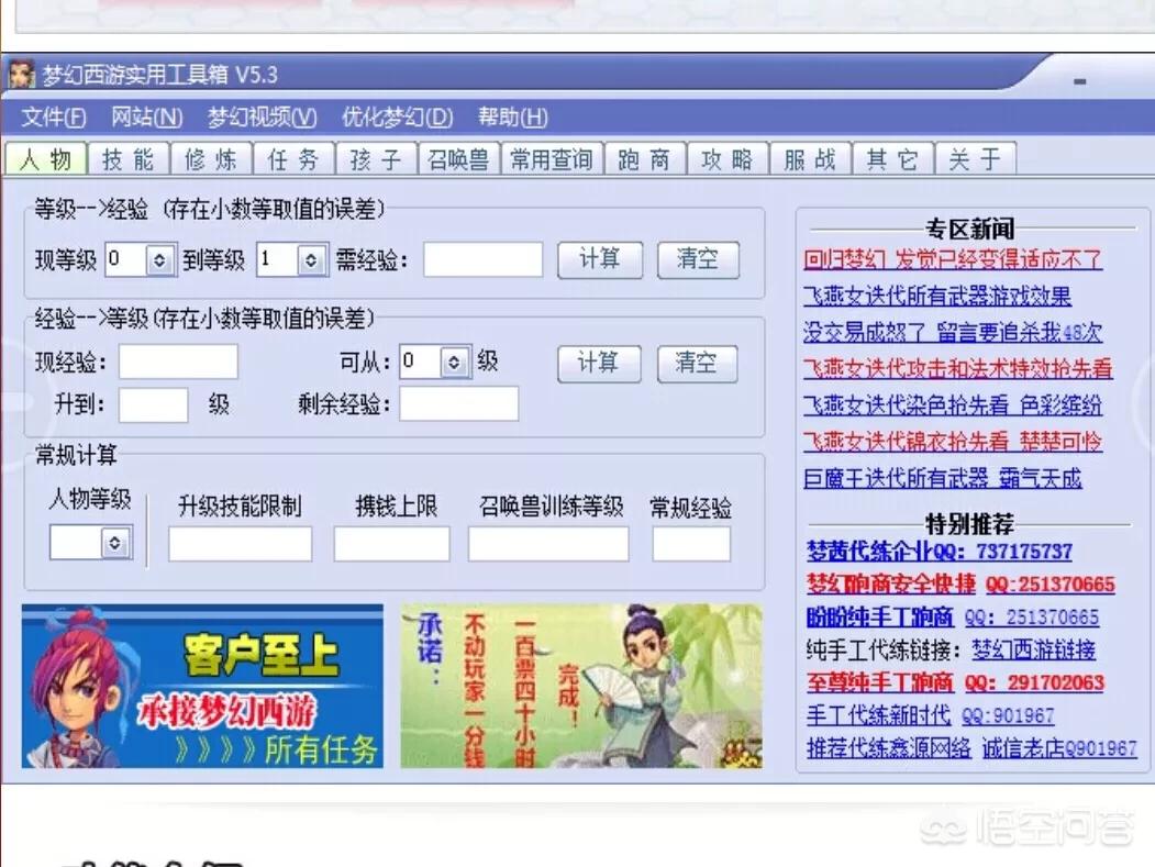 这款工具几乎是全网最好用的了,笔者很多年前就一直在用,看上排的栏目大类就知道他涉猎的项目包含了人,技能,修炼,召唤兽,孩子,所有任务等等只要你能想到的他里面都有,你没想到的他里面也有例如计算阴德等。