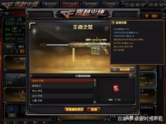 在右上角有一个预览效果,鼠标移动到上面,会看到激活后的属性,大家都知道王者之怒的原型就是巴雷特毁灭,属性也就是因此来定的。右下角红色的宝石,就是我们需要用到的王者之石,前面为现有宝石的数量,后面为升级所需要的数量,目前所知的王者之石的获得方式为活动获得。升级一次应该都是使用90个。我们王者之怒激活后,属性就是跟毁灭一样的了。然后在房间内,后面的V标也会有显示所带的王者标识。武器属性激活成功后,下面的特殊属性激活为灰色,普通的英雄级武器可以使用火线币刷新属性,王者武器只能激活应有的属性,而不能重新刷新属性。这些只是体验服的数据,具体的数据还是以正服为准。不过,策划GG也是用心了,在房间的V标显示这英雄武器跟王者武器,美滋滋啊。我这是在背包没有带英雄级武器狙击的情况下,爆头击杀了对面的敌人,大家可以看到右下角的子弹数为12,这个王者武器是升级后的,所以自己有带2发狙击子弹的加成,非爆头狙杀敌人,子弹数为11发,爆头击杀后,子弹还是为12发,想必大家都知道,英雄级武器爆头击杀会加子弹的。这就是王者武器属性激活后的效果。在右上角,本来王者武器击杀敌人是不会闪动的,而武器激活属性后,跟毁灭一样的,会有闪动效果,由于时间问题下次给大家把图补上。