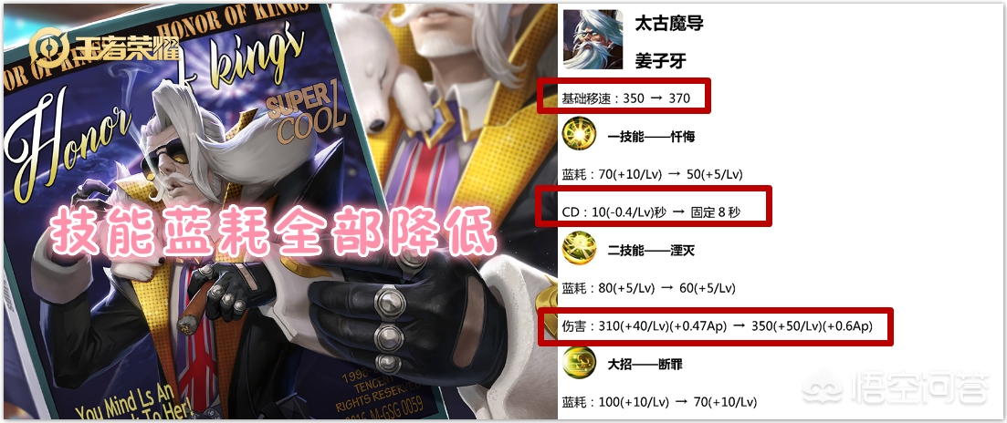 胜率只有42%的姜演员长期倒数第三,这次天美还是大力给他来个彻头彻尾的加强了。蓝耗全面大量下调,基础移速增加20,大招搞定CD8秒,二技能大幅提升伤害。