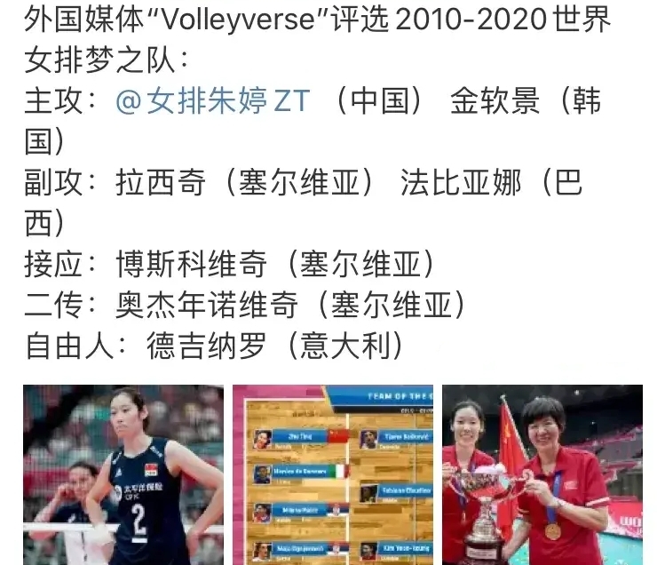 其实,这是媒体《Volleyverse》根据近10年的球员表现而评选出的2010-2020国际排坛女排梦之队阵容,具体名单分别是: