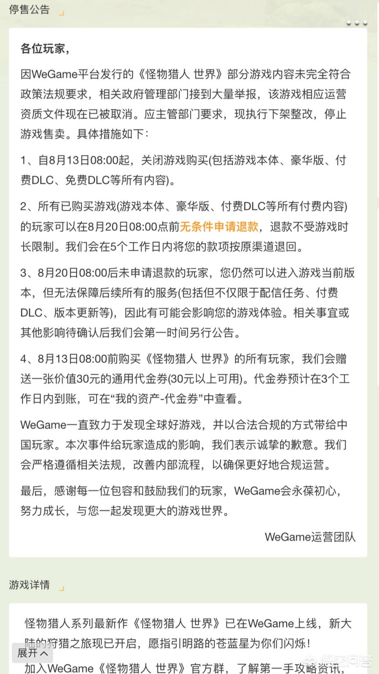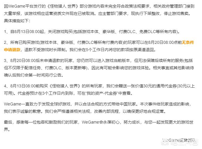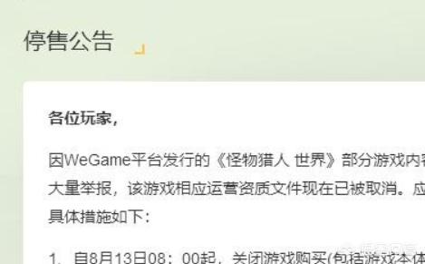 Wegame的《怪物猎人世界》停售,在公告中说的是遭到了大量举报,游戏目前已经在 Wegame 上下架撤回不能对外销售,Wegame 方面也允许购买者在 8 月 20 日之前选择退款,如果不退款还坚守 Wegame 版本的话也能进入游戏,但 Wegame 方面无法保证之后游戏的版本更新和内容更新。