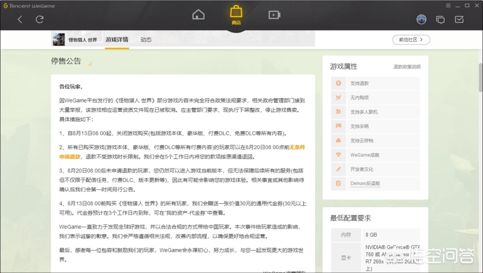 如何看待wegame停售《怪物猎人:世界》