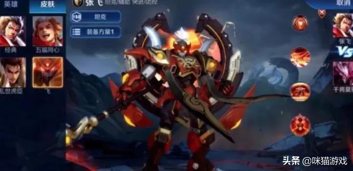 张飞这个英雄在目前这个赛季还算是比较强势的辅助。在游戏表现很不错,也很容易操作。张飞的这款五虎皮肤依旧保持了张飞威猛霸气的外表,同时背后类似屏风的设计,依旧与原皮肤保持一致,机甲风格也是暗黑系,一反前两款皮肤。终于来看,还是不错的一款皮肤!