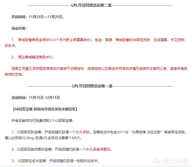 粉丝的呼声太强大,再加上官方对于iG夺冠的宣传力度太小,王思聪直接出面和官方交涉,讨个说法,最终客户端还是将iG夺冠的图片替换上了, 同时也放出了iG冠军回馈活动,目前已经公布了两波: