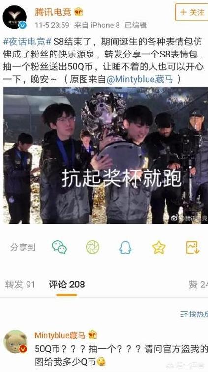 但是从另一个方面来看,虽然这个微博挂着腾讯的名头,其实他的关注度以及粉丝都是很少的,最多时也就几百条评论,少的时候几十条都是常事。而IG在夺冠的第一时间,这个微博也抽出了价格不菲的外设,翻看从前的微博,很多时候他们也都是抽50QB,而那条微博怎么看也只是一条50QB的晚安博,目的也是为了给这个官博拉一些关注罢了。而IG的高层在自己微博下也评论道:后来也意识到可能是一个员工开心用自己的钱抽的罢了。