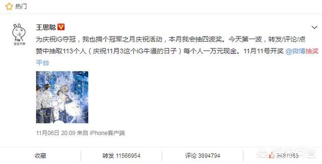 王思聪自掏腰包113万,抽取113个人,一人一万,纪念11月3日IG夺冠.不得不说校长就是校长,一人之力堪比整个国服,国服做起活动,估摸着也就一百万的额度.