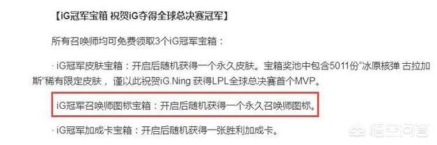 经过交涉之后虽然客户端换成了IG夺冠版面,大家还是比较不服。随后的冠军奖励更是让人吐血,不仅仅没有夺冠图标,甚至永久皮肤抽奖都没有,只有30日的皮肤抽奖。可是惹怒一波人。