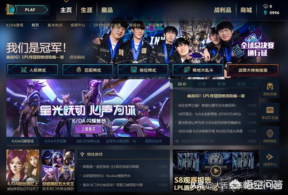 iG夺冠本是举国上下粉丝们欢腾庆祝的日子,然而,好像官方并没有那么重视iG这个LPL第一个S系列赛冠军,首先比赛第二日客户端就替换成了K/DA女团的广告展示,而iG夺冠只给一小个豆腐块窗口,不仔细看还真找不到。