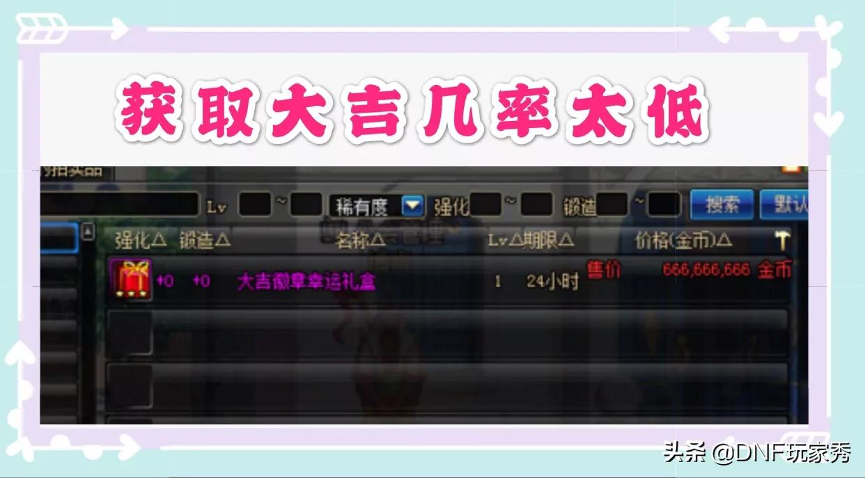 DNF10.31版本,策划在商城上架了“吉祥幸运礼盒”,售价777点券,打开后可以随机获得增幅/强化/徽章/时装礼盒,然后礼盒分为“末,小,中,大”四种等级,等级越高,随机到的奖励越好。礼包中有20张“调级券”,如果不满意等级,可以调整,调整后依然是4种等级随机出现一种。说白了,还是看脸的活动!