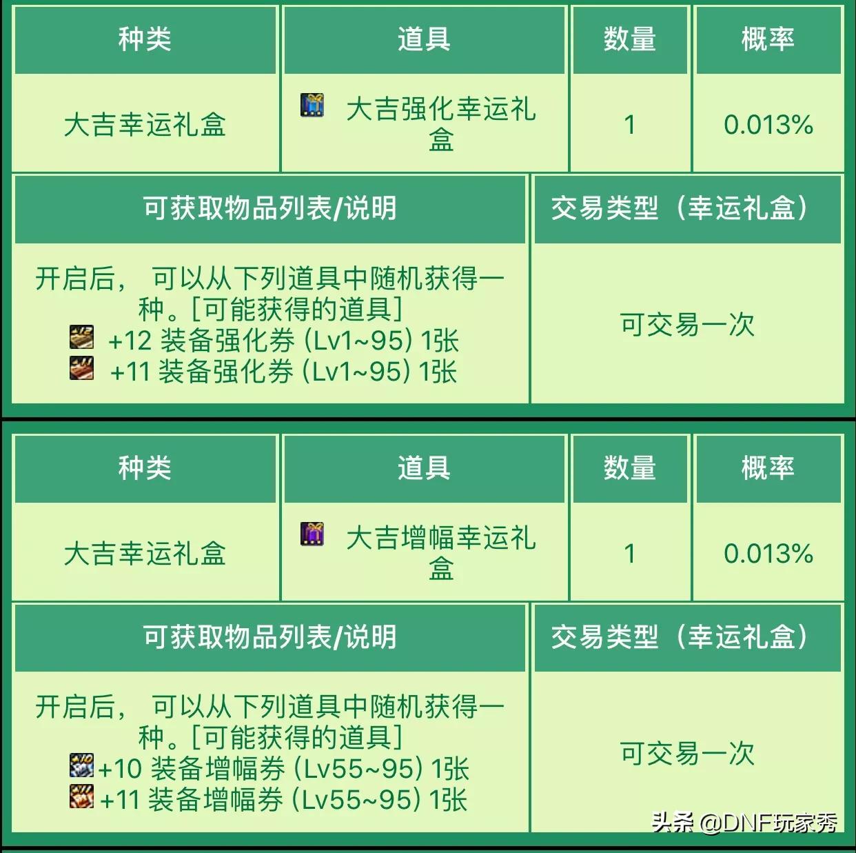其中,“末,小,中”三种等级礼盒不能交易,最好的“大吉”礼盒可以交易,但是只能交易一次,黑商无法染指;其中大吉增幅礼盒,可以在增幅10和11中随机获得一张;大吉强化礼盒,可以在强化11和12中随机获得1张;大吉时装礼盒,可以在2张天空券和4张高级券中随机获得一个;大吉徽章礼盒,可以在梦想白金1个和4个灿烂徽章自选中随机获得一个。